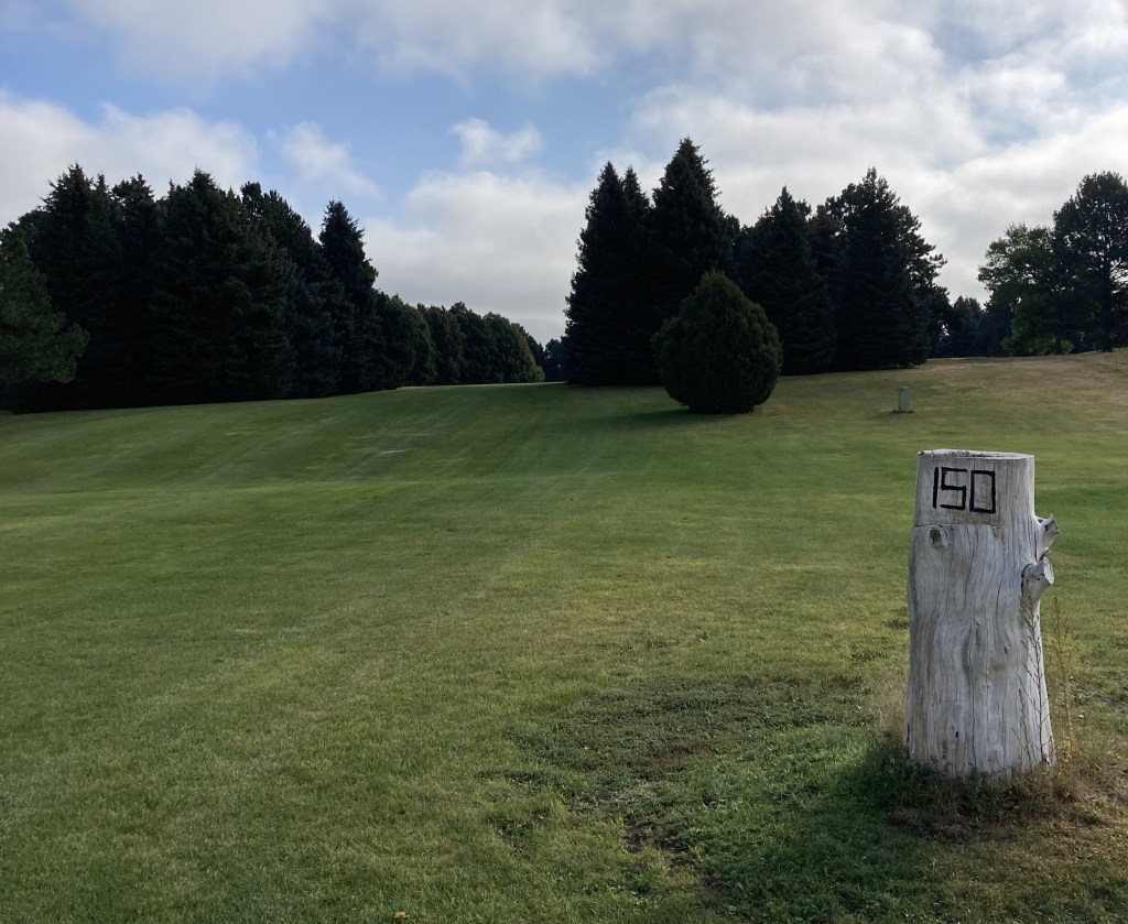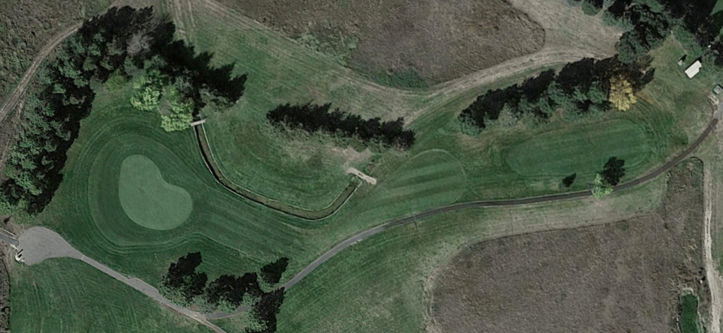 Back nine: The back nine, from ten to sixteen is largely flat. Ten is a good par four that doglegs around a pond surrounded with trees. Thirteen is a short par four with a pond in front of the green that looks like someone reversed a shrink ray on someone’s backyard pool. The back tees on the fourteenth put you out along a dirt road into someone’s pasture. Fifteen is a dogleg right that rewards a draw if you’re unwilling to lay up.
