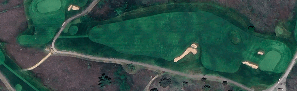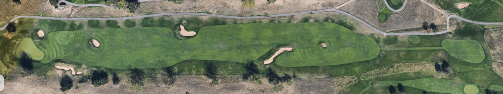 Three: The third is a par five that plays straight towards the mountains. From the tee, a diagonal bunker coming into the fairway from the left has to be carried to have a good shot at the green that’s guarded at the front by a centerline bunker. Large mounds to the left block the hole from the road and help to diminish the sound of tires. As I mentioned, the green complex is modeled after the punchbowl at Chicago with mounds all around and a gathering spot in the back. Check out the bunkers that hidden at the front left of the green for creative earthwork.