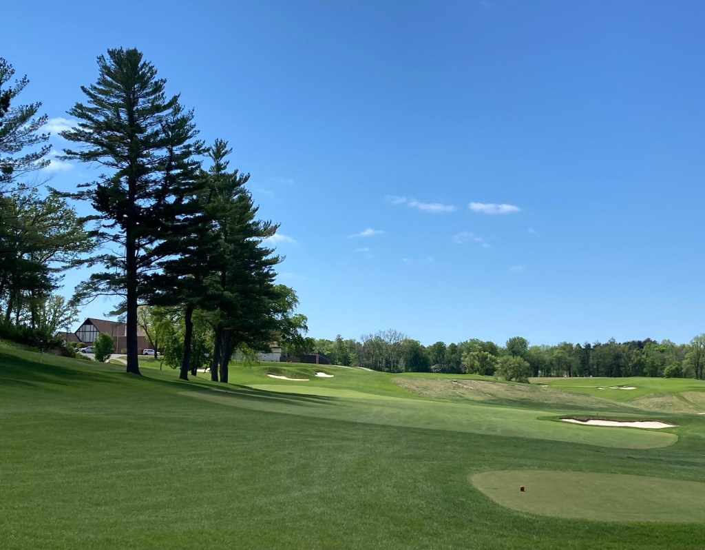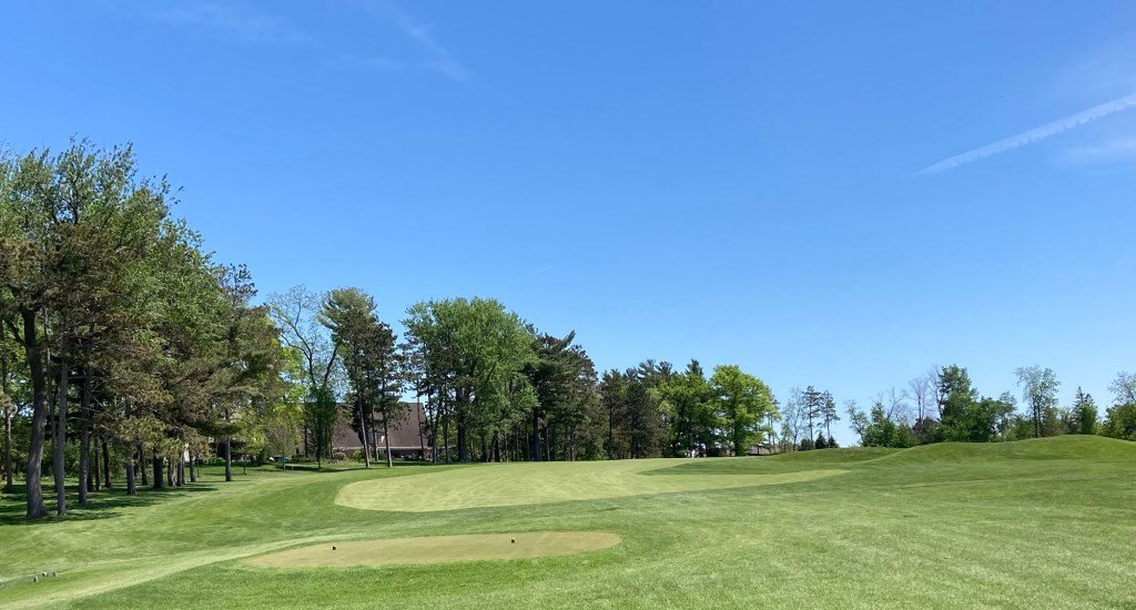 Four: Rochester has two par fives and they’re only one hole apart. The first starts in the southwest corner of the property where many of the white pines were killed by a DuPont chemical application. The lawsuit over the incident largely funded the ten million dollar restoration. The fairway swings out to the edge of the hill before plummeting down toward the clubhouse and back up to a green protected by two decieving fairway bunkers left and a greenside bunker right. It’s better to hit the green than pinseek here as misses left and long fall of sharply.