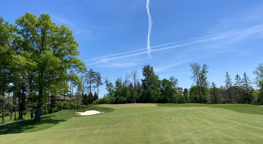 Fifteen: The fifteenth follows a dramatically steep par three up towards the highest point on the property. The hole doglegs softly right to the top of the hill that obscures the green. Once it’s been crested, the fairway leans right to left ready to shoot short shots into the rough behind a tree or into the greenside bunker. I wouldn’t attack any pins that aren’t in the middle as falloffs on the left and front will leave an imprecise shot scrambling up a steep slope. This is a sneaky hole where the conservative play will prevent doubles or worse.